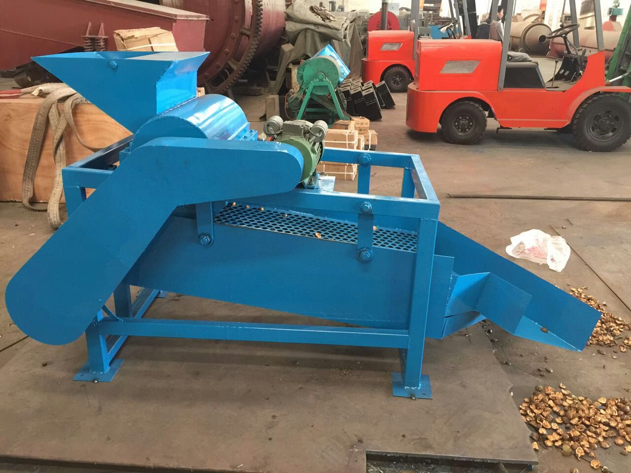 新型茶籽脫殼機結構及工作原理:本機有進料斗,紋桿滾筒,棚條凹板,風機,比重分選篩,風送機等部分組成。茶籽由人工送入進料斗,先滾到滾筒里,由于紋板轉動與棚條凹板間的搓力,將茶籽殼仁剝離,剝離后的茶籽仁與殼同時經過前凹板孔落下,在通過風道時,由風李將大部分茶籽殼吹出機外,一小部分未剝離的茶籽小果一起落入比重分選篩,經過篩選后由分選篩面上行,通過出米嘴流入麻袋,而尚未剝離茶籽小果則由篩面下行,經過出料道口流入風送機,再由風送機送如滾筒,進行二次剝殼,再經過比重分選篩分選,便可都被剝凈。